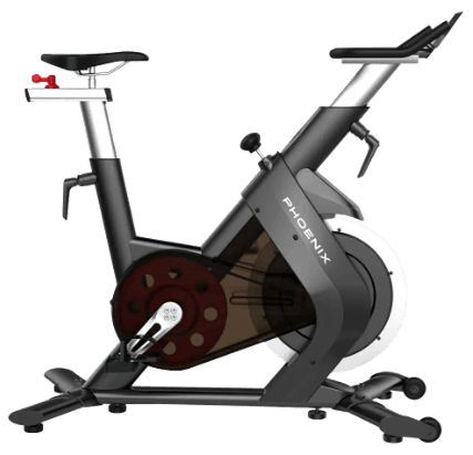Bike com freio magnético e volante de inércia para aulas e treinos intensos.