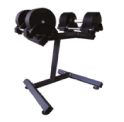 Kit completo com dois halteres ajustáveis e suporte organizador.